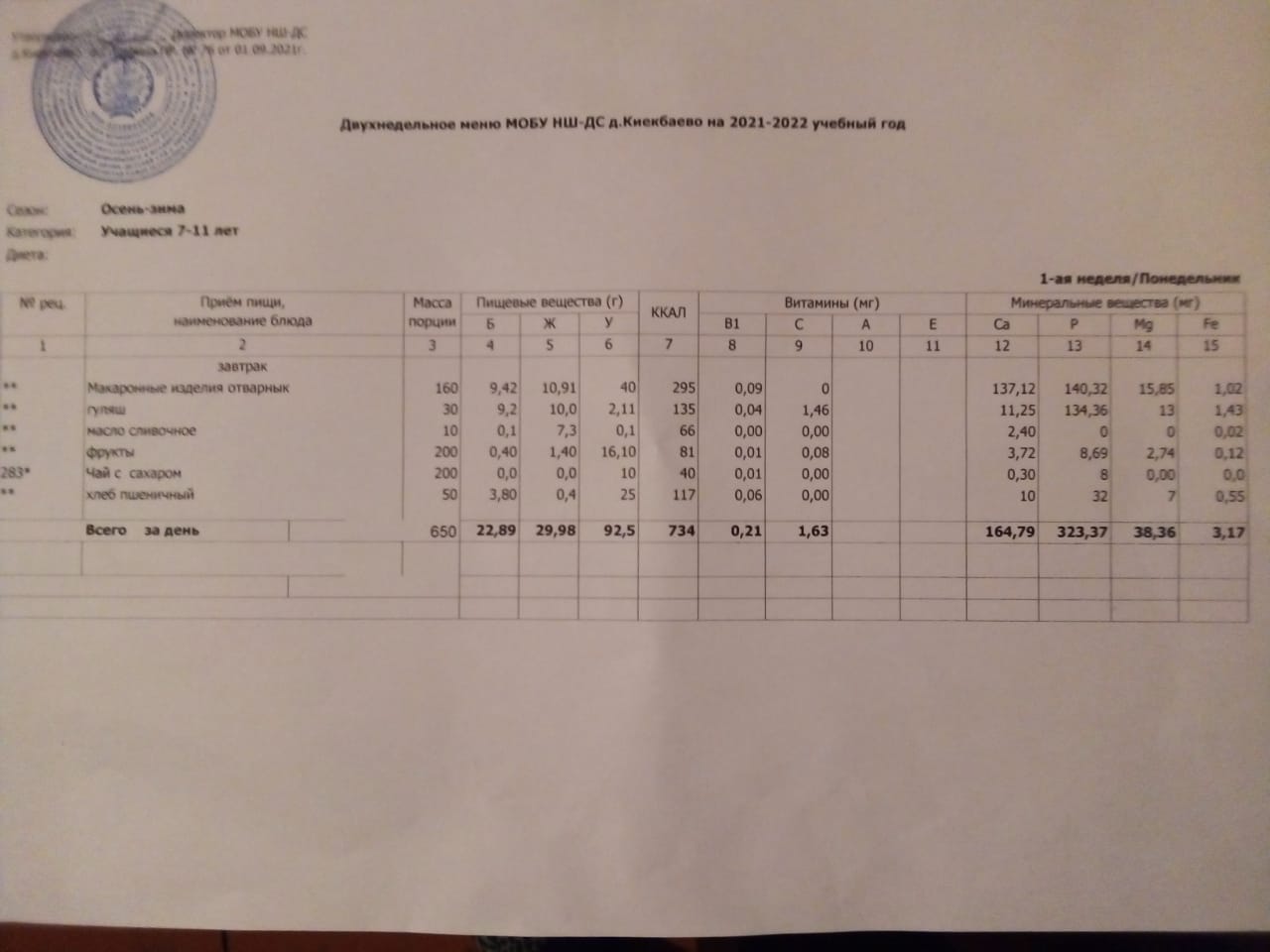 (Меню на 2021/2022 учебный год. Вторая неделя (понедельник, вторник, среда))